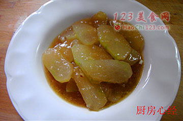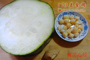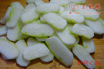 3、冬瓜切大块。如果讲究一点的话,就修去冬瓜块的棱边。吃到嘴里顺口。然后,再将冬瓜切成厚片。