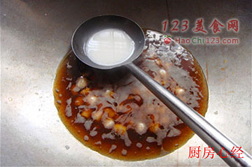 8、再开锅后,用水淀粉勾芡。装入碗中备用。