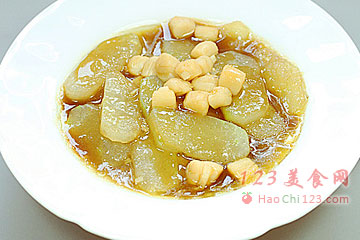 9、将蒸制后的干贝及干贝水倒入锅中,调入适当的清水,酱油,勾芡后,浇入冬瓜片上即可。
