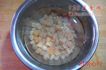 2、干贝提前用清水泡2小时。然后剔除干贝侧面的硬芯,也叫闭合肌。将干贝放入容器中,上火蒸制1小时。