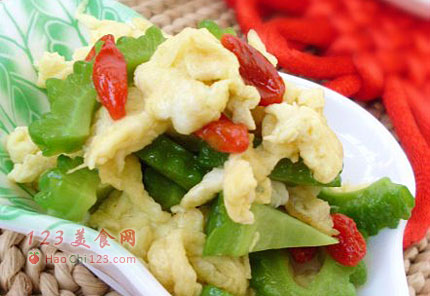 5、锅内留底油,放葱蒜末爆香,倒入苦瓜翻炒,然后放鸡蛋,加适量盐调下味,最后放入枸杞子翻炒一下,放一点味精,临出锅时滴上几滴香油就好了。[sushi.laoyanhuo.com]