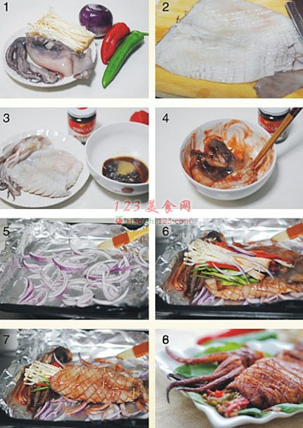 6、将腌好的鱿鱼铺在烤盘上,将金针菇、青红椒丝、洋葱丝卷用鱿鱼卷起来。