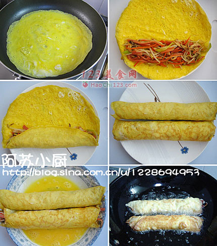 3、吉祥如意卷。豆芽的形状就像如意,用鸡蛋来卷,预意着吉祥如意。蛋皮的香配上香菇的香、火腿的味、黄瓜和豆芽的爽脆,特别好吃。[sushi.laoyanhuo.com]