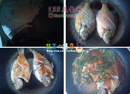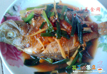 5、鱼煎好后,锅中放入葱白与姜丝煸出香味,然后到入调好的汁,开锅焖上半分钟,然后翻面也焖半分钟,这样汁的鱼身就充分的吸收了汁的味道。时间到后,大火收汁就可以出锅啦(如果有担心咸味是否够的话,在起锅前,你筷子蘸点锅里的汁尝尝,咸淡合适,那么鱼的味道就OK啦)。