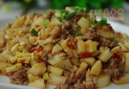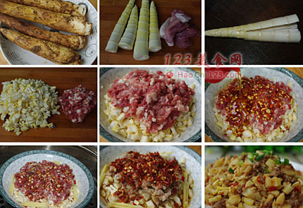 3、取一个碗,切好的春笋放下面,肉末放上面。
