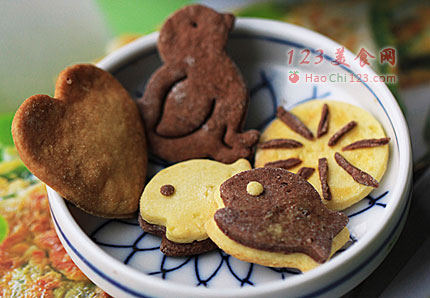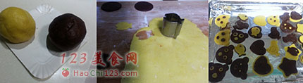 10、巧克力面团也同样操作压出形状后,表面刷上蛋液,再将以上原味的各类形状面皮盖在上面,两种颜色面团可以互相调换。