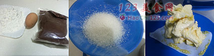 7、得到黄色的原味面团及黑色的巧克力味面团各一个。