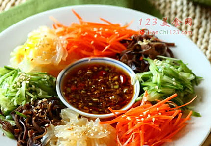 2、黑木耳清水泡发后切成细丝,胡萝卜切丝,小黄瓜去皮切丝。