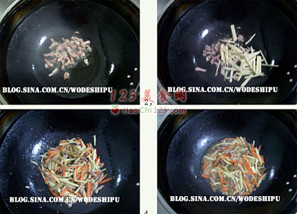 2、放入冬笋和精肉一同翻炒,放入少许的盐调味。