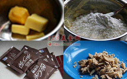 2、黄油室温下变软,低筋面粉过筛,核桃仁切小块备用。