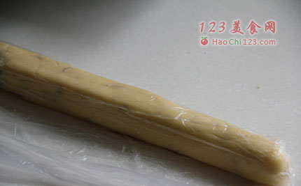 6、将面团放入保鲜膜滚成长条,放入冰箱冷藏发酵下一小时。