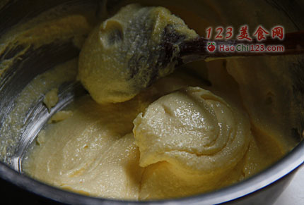 3、将黄油搅拌变白,砂糖分三次放入,充分搅拌。