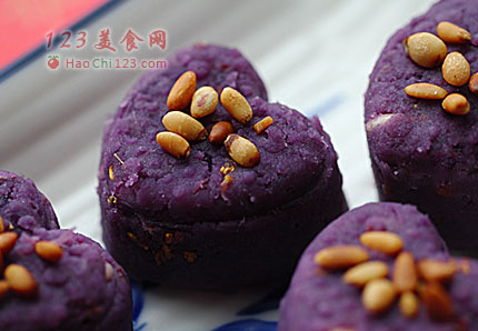 5、取出紫薯糕并在上面摆放干果仁即可。