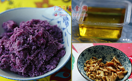 1、紫薯洗净煮熟,剥去皮塌成薯泥待用。