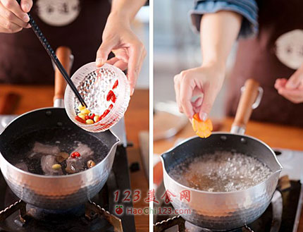 3、锅中加排骨、生姜和葱白,加水煮开,再加入白果、枸杞、桂圆肉,再次煮开。