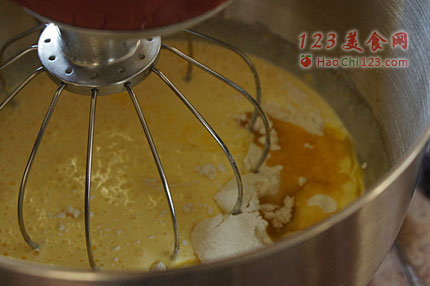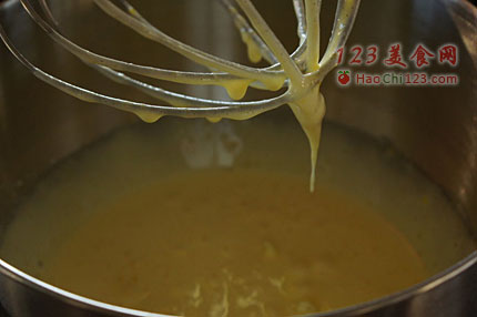 3、往蛋液里加入面粉,盐,泡打粉,柠檬皮擦丝和融化黄油,中速搅拌均匀。