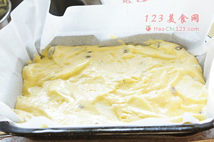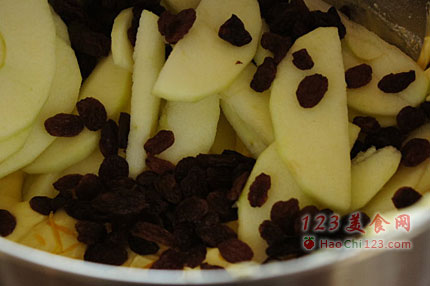 4、加入一大半的苹果片和葡萄干,用橡皮刮刀搅拌均匀。
