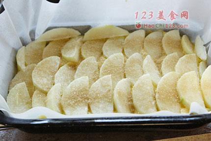6、铺上剩余的苹果片,撒上咖啡棕糖。