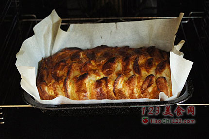 7、放入预热好的烤箱,烤45分钟至表面金黄。如果选用深小的模具,烤制时间相应延长。用足签插入,苹果软熟即可。