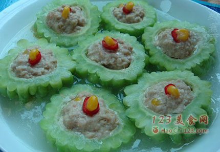 3、在苦瓜中填入2,上蒸过蒸5分钟出锅。