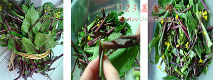 4、红菜苔一定要用手择菜,才能感觉出它的老嫩,老的地方去皮留杆,而且这样炒出来才好吃。