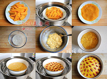 1、第一次蒸南瓜发糕时面糊和的太稀了,而且蒸的时候没盖保鲜膜,所以蒸出来的发糕口感很黏,且发糕中间因为水蒸气的原因塌陷了下去,第二次将面糊调的浓稠了些,蒸的时候盖上了保鲜膜,且按照tony小屋的方法进行了二次发酵,成品就改进了很多。