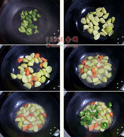 2、起油锅炒土豆块。