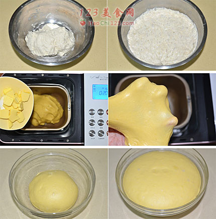 3、将除黄油以外的所有材料一起放入PE8500W面包桶中,启动面包机面板上的IMix功能开始揉面,揉面结束面团已经揉至表面光滑,此时加入软化黄油。