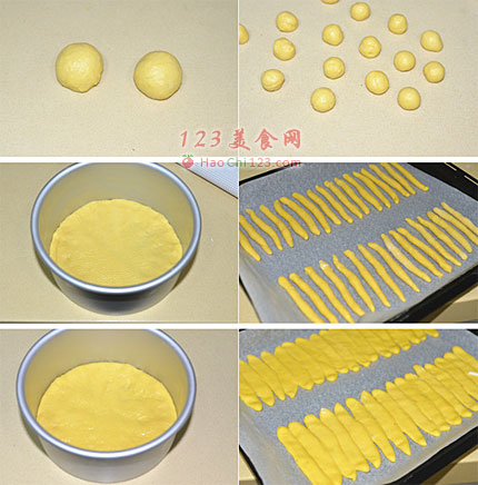 10、小面团逐一揉成条状,长度要比6寸圆模的高度稍长一点,间隔着放在铺了油纸的烤盘上。