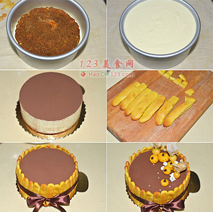 17、用一根根面包片沾在蛋糕外围,用缎带固定好。