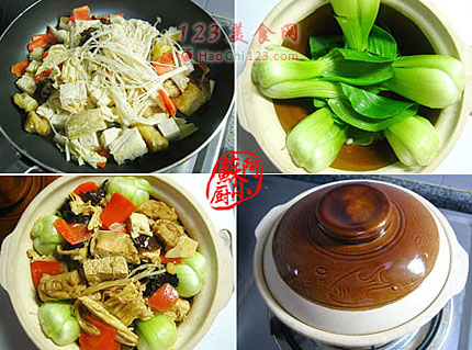 7、砂锅中铺上油菜,将炒好的材料倒入,小火焖20分钟,最后淋一点点麻油提味,即可。