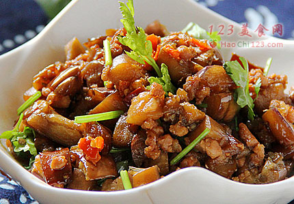 2、茄子洗净切成小丁。