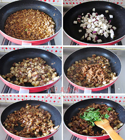 10、倒入煸炒好的肉糜。