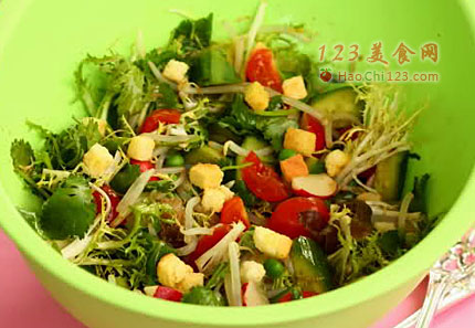 3、食用前将调和好的油醋汁,浇在蔬菜上,拌匀撒上香草奶油味的烤面包粒即可。