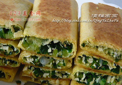 7、用煎饼做的韭菜盒子,这样煎过之后,皮很酥脆。馅料很清淡,很好吃。