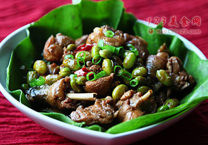 6、加热水漫过鸡肉,大火煮滚,转小火10分钟后,放入毛豆米和切好的荷叶条。