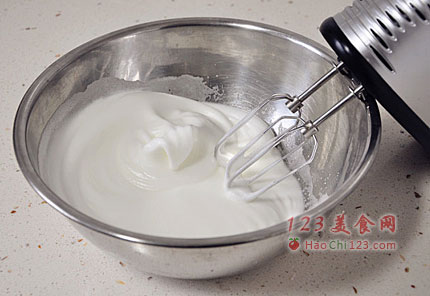6、用电动打蛋器打至粘稠状,拉出打蛋器后上面粘着的蛋白糊不滴落,呈三角状即可。