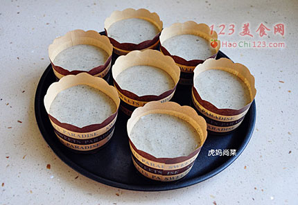 8、将混合糊依次倒入蛋糕纸杯中,七分满即可。