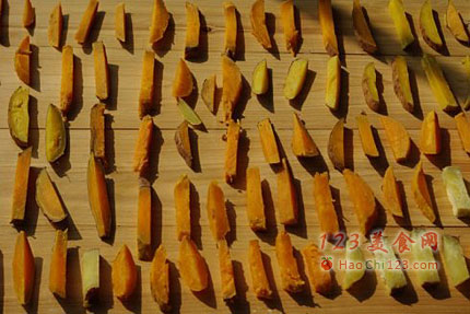 3、蒸好的红薯放凉后,切成1CM见方的长条,放在案板上晒干即可,时间不好说,看天气而定,我家的红薯红心、黄心、白心的都有咧。