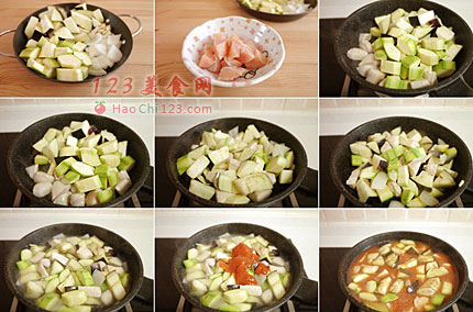 4、放入茄子,洋葱,西葫芦,大蒜,撒上盐和白胡椒粉,继续炒1.5分钟。