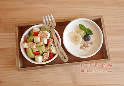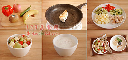 1、蔬果类洗净切小丁,鸡肉或鱼肉煎成金黄色再切小丁就好,撒一点黑胡椒和盐调味,虾的话煮熟剥壳就好。