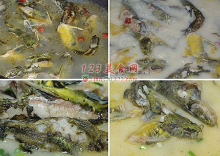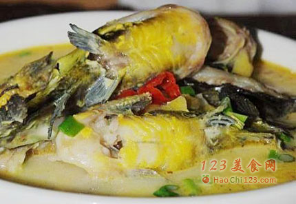 2.锅置旺火上,加入植物油,烧至六成热时下入黄鸭叫,两面煎黄,然后放干椒段、蒜末、姜末一起煸炒香,然后加水没过鱼,大火烧开后改中小火炖,一直炖到汤成乳白色。