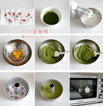 7、将樱花铺在模具底部,倒入面糊至7、8分满。