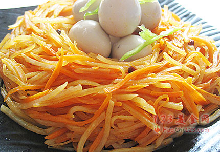 2、先把胡萝卜丝下入锅中翻炒再放土豆丝,胡萝卜丝遇油释放大量胡萝卜素有益人体健康,而土豆则相反,土豆易吸油脂,大量油脂对人体无益。