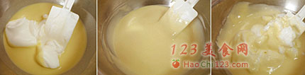7、打发好的蛋白先少量加入面糊里,混合,再放入剩余的蛋白,搅拌均匀。