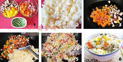 4、把混合好蛋液的米饭翻入锅中用力翻炒。