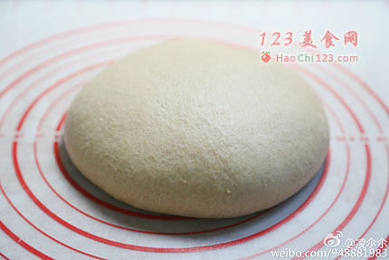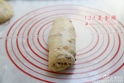 6、将面团拍开(我用手操作,不用擀面杖),从上往下卷起,收好收口朝下放置。