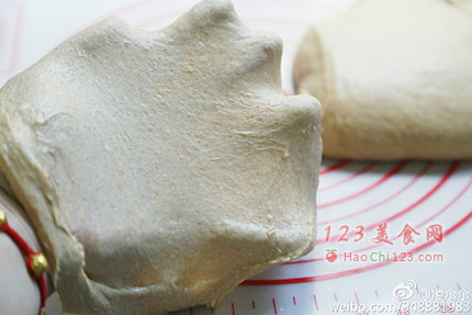2、加入黄油揉进面团,直到黄油与面团融合,面筋可以拉出一层面团筋膜即可。