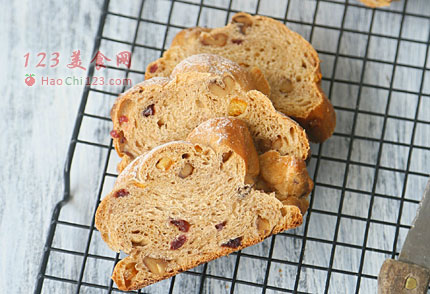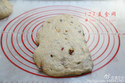 3、加入蔓越莓、橙皮丁、核桃揉进面团。