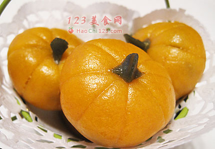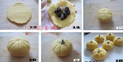 18、如上依次做完其他的南瓜。做好的南瓜,装入盘中上蒸屉,锅开后蒸五分钟即可。